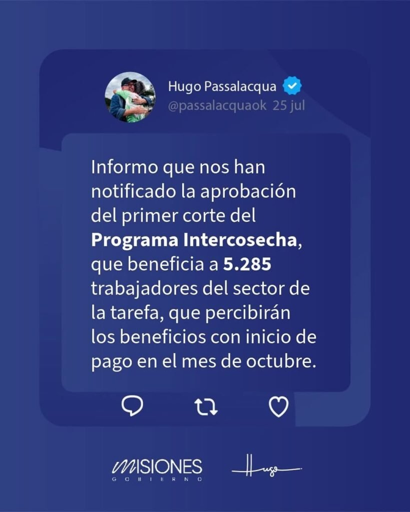 El gobernador Hugo Passalacqua informó que el Gobierno de Misiones recibió la notificación oficial de la aprobación del primer corte del Programa Intercosecha, que beneficiará a 5.285 trabajadores del sector de la tarefa con pagos a partir de octubre.
